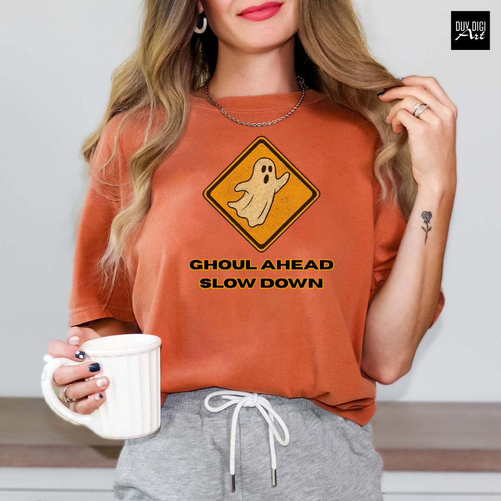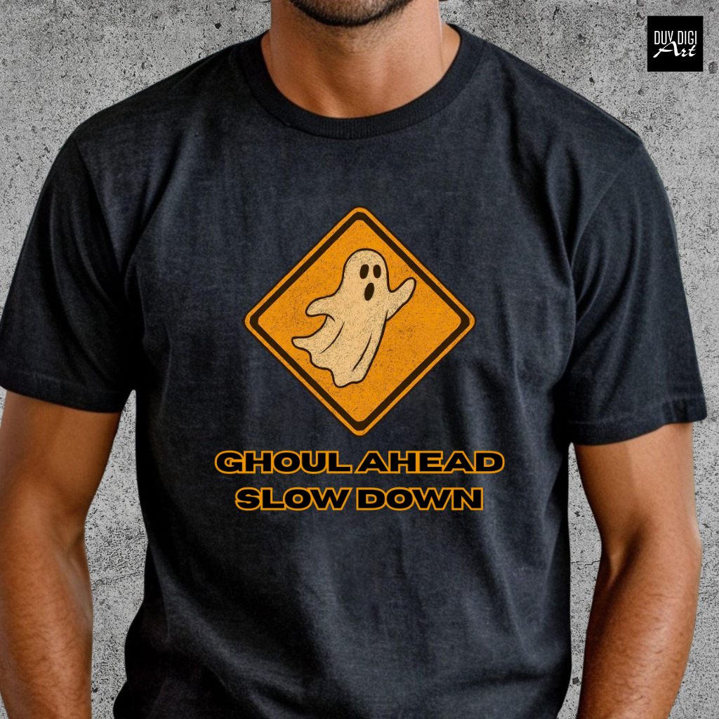 Warn the neighborhood in style with this hilarious and festive “GHOUL AHEAD SLOW DOWN” T-shirt design! This high-resolution PNG features: