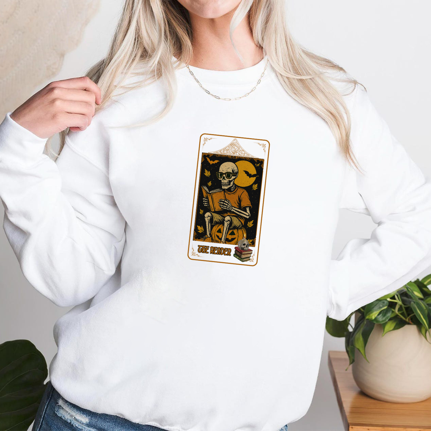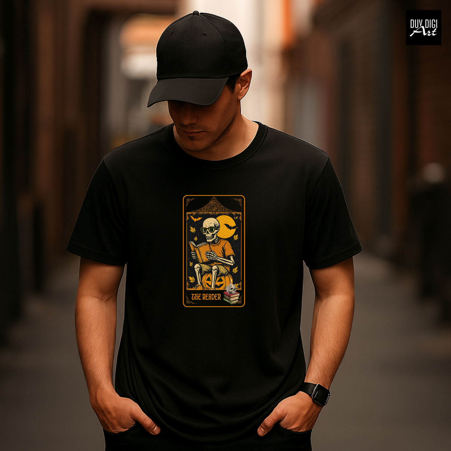 Celebrate the spooky season with a twist of wisdom! This unique digital artwork features a laid-back skeleton in sunglasses, perched on a carved pumpkin, engrossed in a good book. Surrounded by flying autumn leaves, a crescent moon, and a gothic canopy, this design blends Halloween charm with literary flair. The bold title “THE READER” anchors the piece, making it perfect for book lovers with a spooky side.