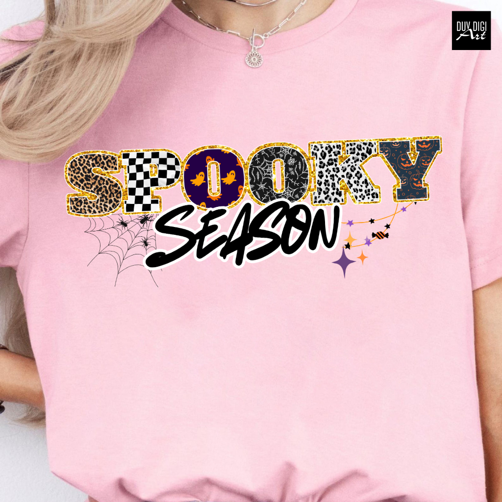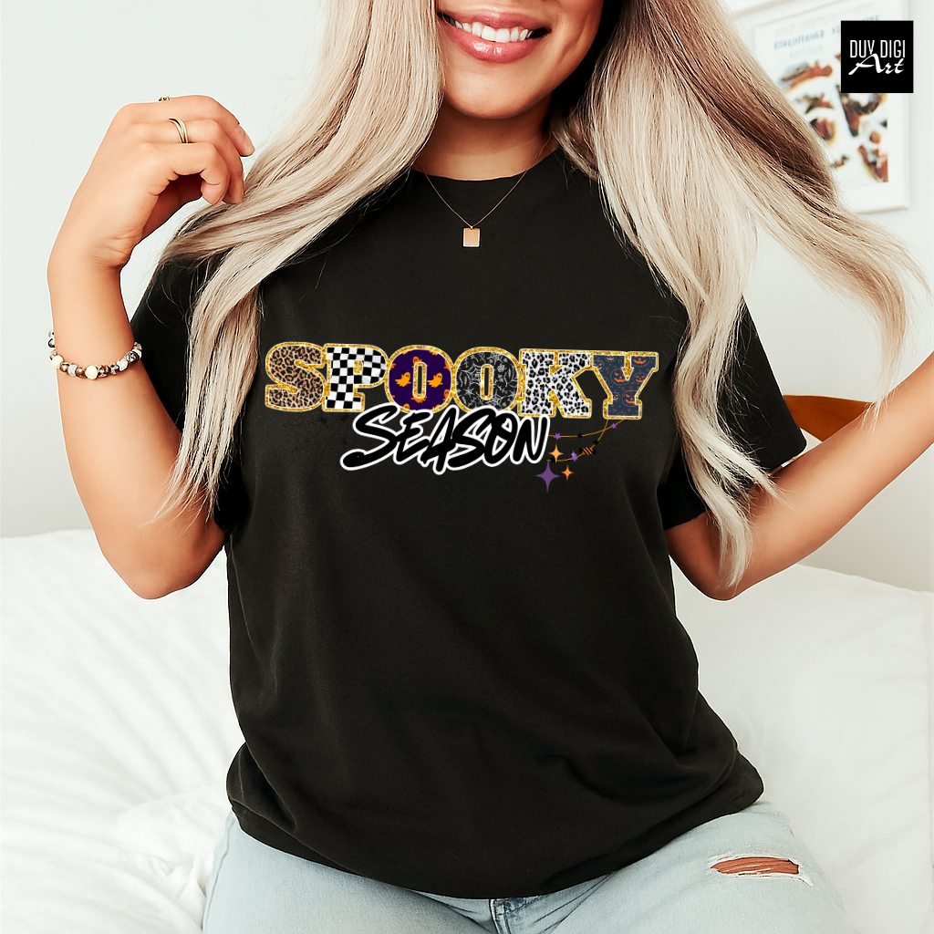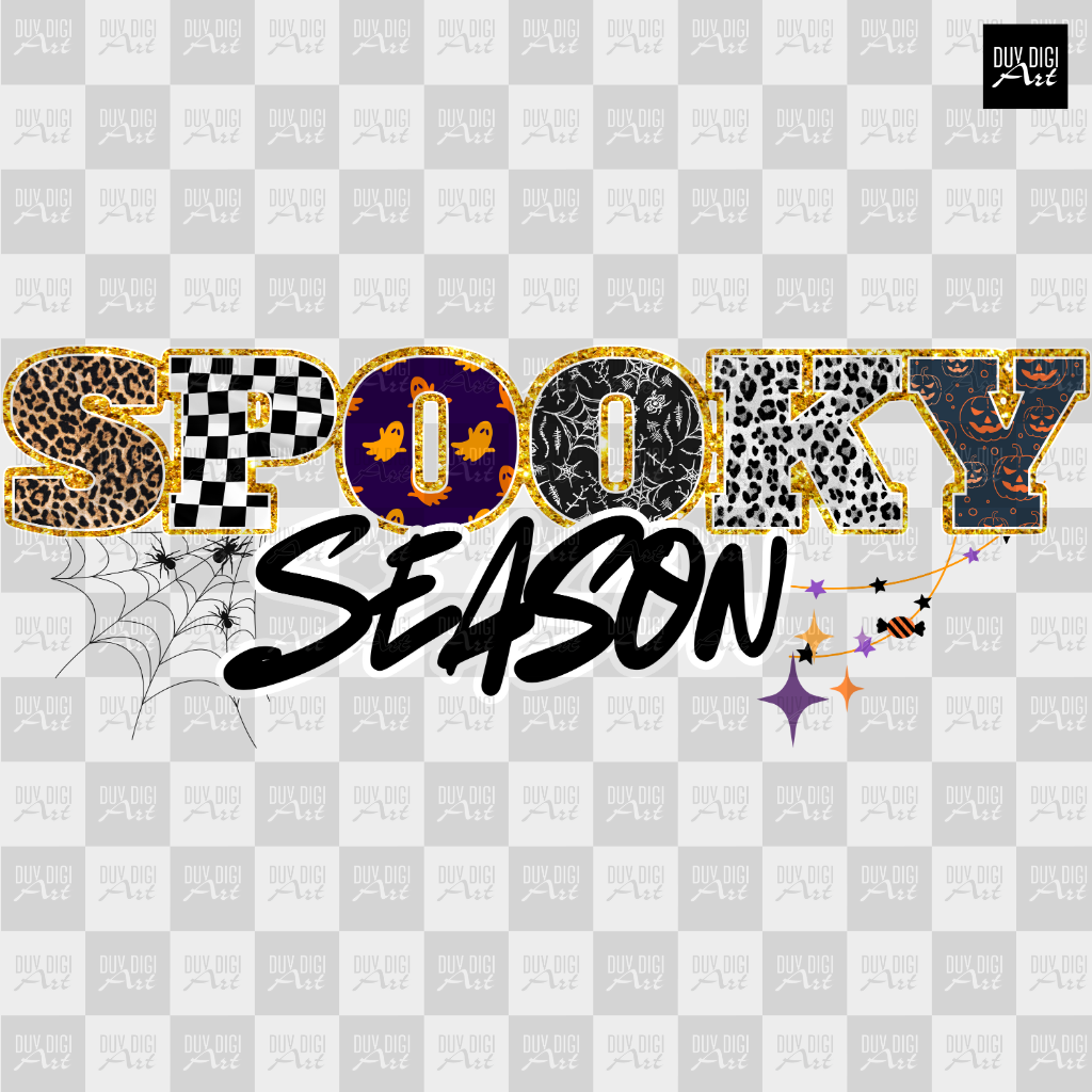 Make your Halloween designs pop with this eye-catching “Spooky Season” digital artwork! Each letter in “SPOOKY” bursts with personality—featuring leopard print, checkered patterns, glitter textures, bats, stars, and more—while the bold brushstroke “SEASON” grounds the design with flair. Accented by spider webs, stars, and a flying broomstick, this piece is perfect for adding playful spookiness to any product.