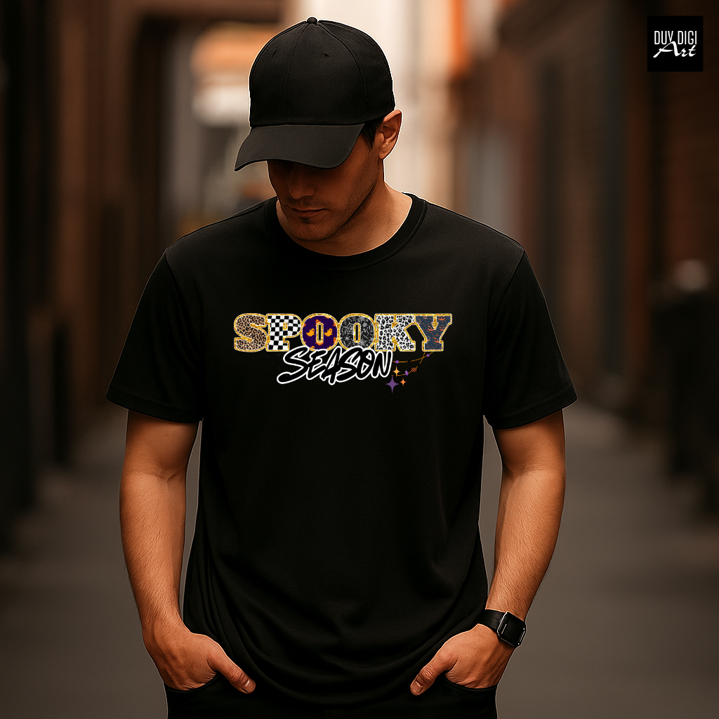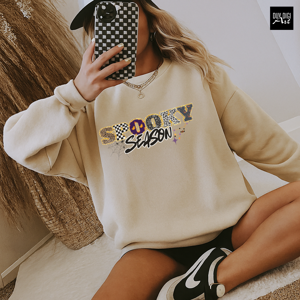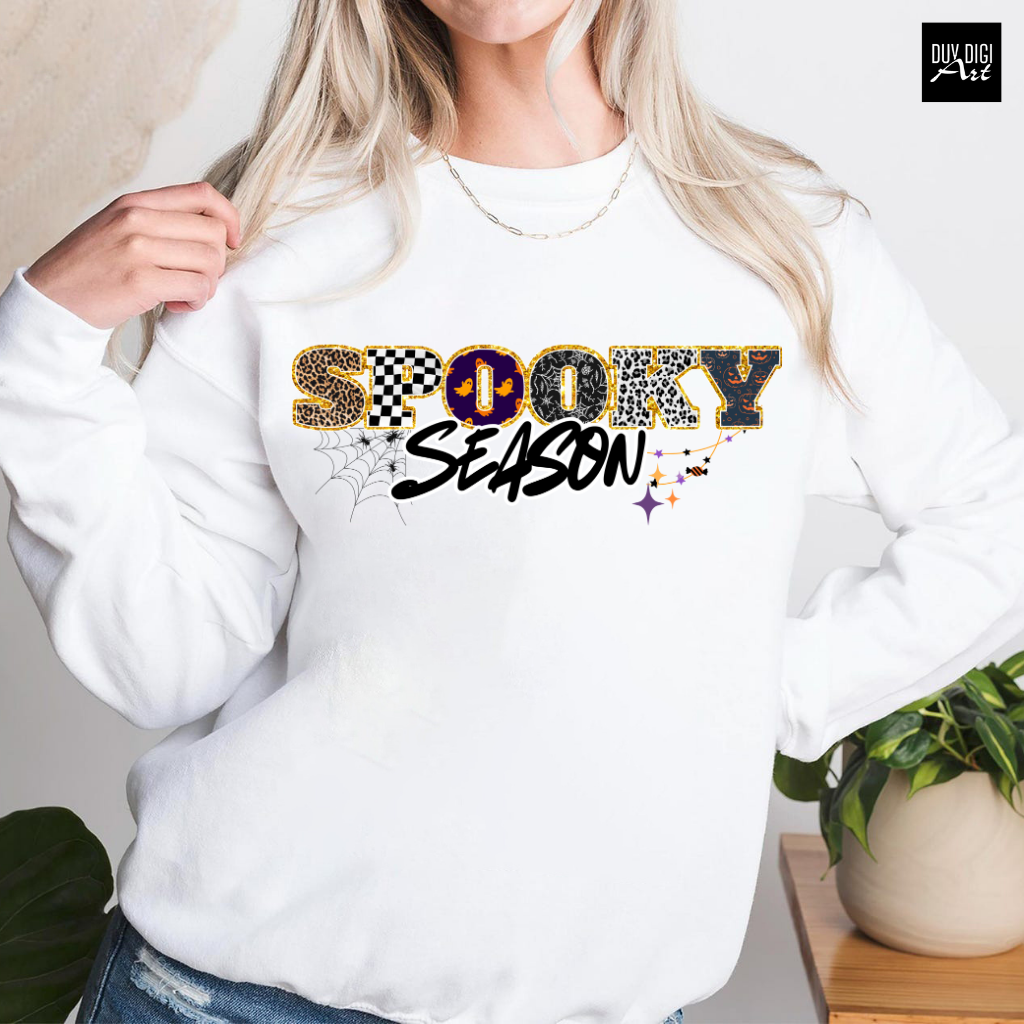 Make your Halloween designs pop with this eye-catching “Spooky Season” digital artwork! Each letter in “SPOOKY” bursts with personality—featuring leopard print, checkered patterns, glitter textures, bats, stars, and more—while the bold brushstroke “SEASON” grounds the design with flair. Accented by spider webs, stars, and a flying broomstick, this piece is perfect for adding playful spookiness to any product.